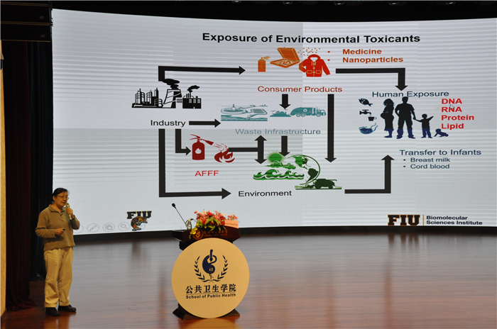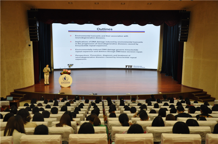 5月6日上午,公共卫生学院2019年度学术活动暨公卫国际论坛系列活动(二)在百汇堂举行,弗罗里达大学Liu Yuan副教授受邀莅临Beat365温江校区作《Environmental Toxicants and Human Neurodegenerative Diseases》专题讲座,四川大学华西公共卫生学院张遵真教授作为报告解读嘉宾全程参与了此次活动。发展规划处副处长吴曦,公共卫生学院院长陈大义、副院长饶朝龙,部分教师及同学参加了讲座。讲座由饶朝龙主持。