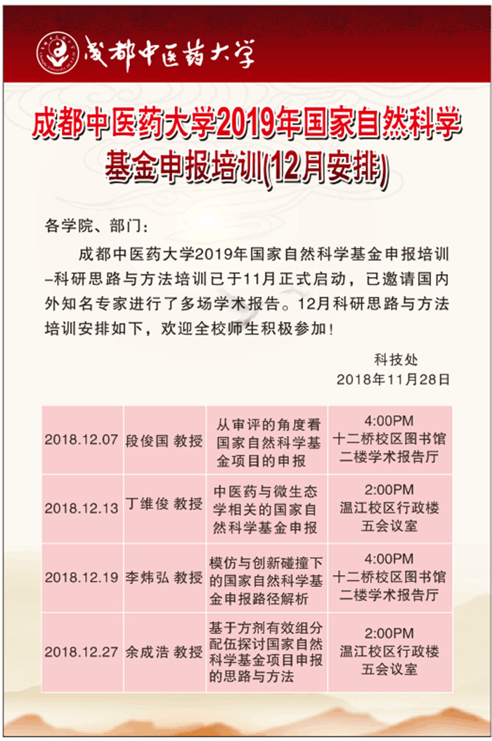 Beat365中文官方网站2019年国家自然科学基金申报培训(12月安排) 发布时间:2018-11-28 16:35:00 浏览次数: 次 【字体:小 大】 【打印正文】 上一条:Beat365中文官方网站2019年国家自然科学基金申报培训科学思路与方法培训 下一条:胡义扬教授应邀来Beat365作国家自然基金选题及书写讲座