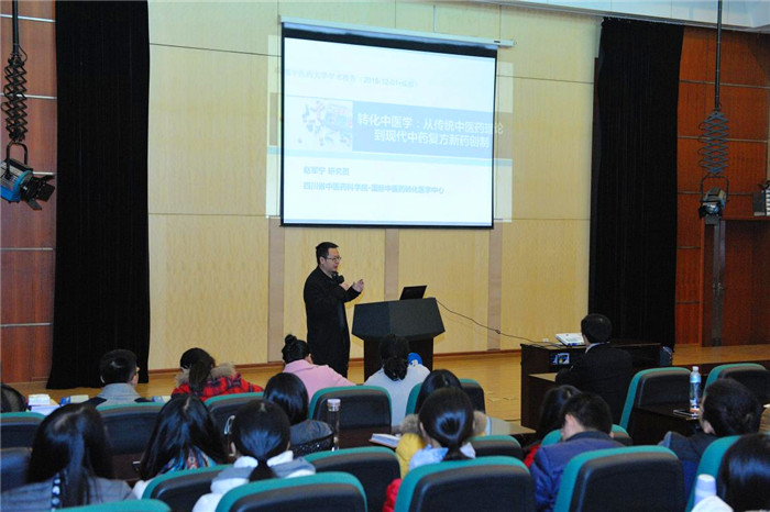 12月1日下午,四川省中医药科学院院长赵军宁研究员应邀来校,作题为“转化中医学:从传统中医药理论到现代中药复方新药创制”的学术报告,科技处副处长唐勇教授主持报告会。