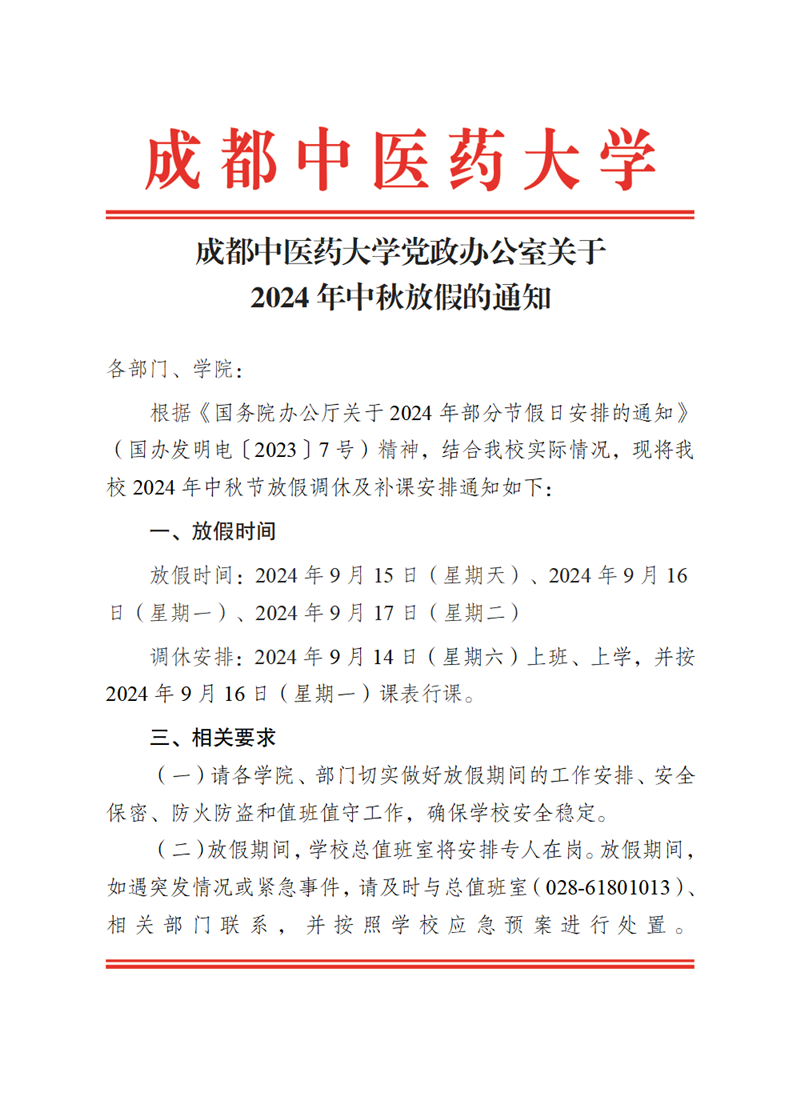 Beat365中文官方网站党政办公室关于2024年中秋放假的通知 发布时间:2024-09-10 15:11:15 浏览次数: 次 【字体:小 大】 【打印正文】 上一条:关于进行防空警报试鸣演练的通知 下一条:关于学校公共资源开放与服务保障时间调整的通知