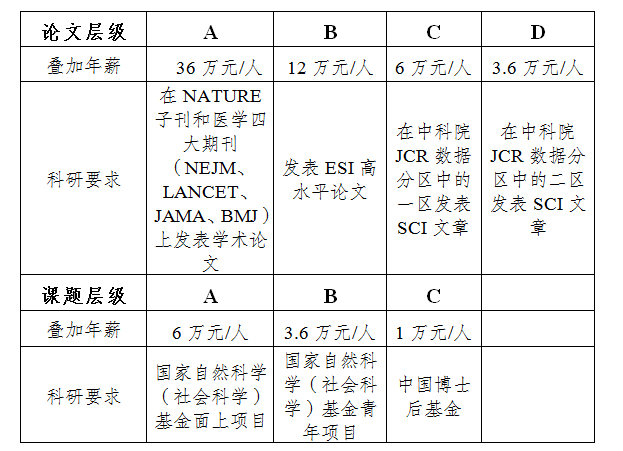 1.基础年薪:提供基础年薪15万元/人(系税前金额,以下同)或20万元/人(入职前已发表3篇SCI或1篇影响因子5分以上SCI),包括岗位工资、薪级工资、其他工资型津贴、承担规定的教学科研工作量的岗位津贴、社会保险和公积金的个人缴纳部分、博士后住房补贴等。