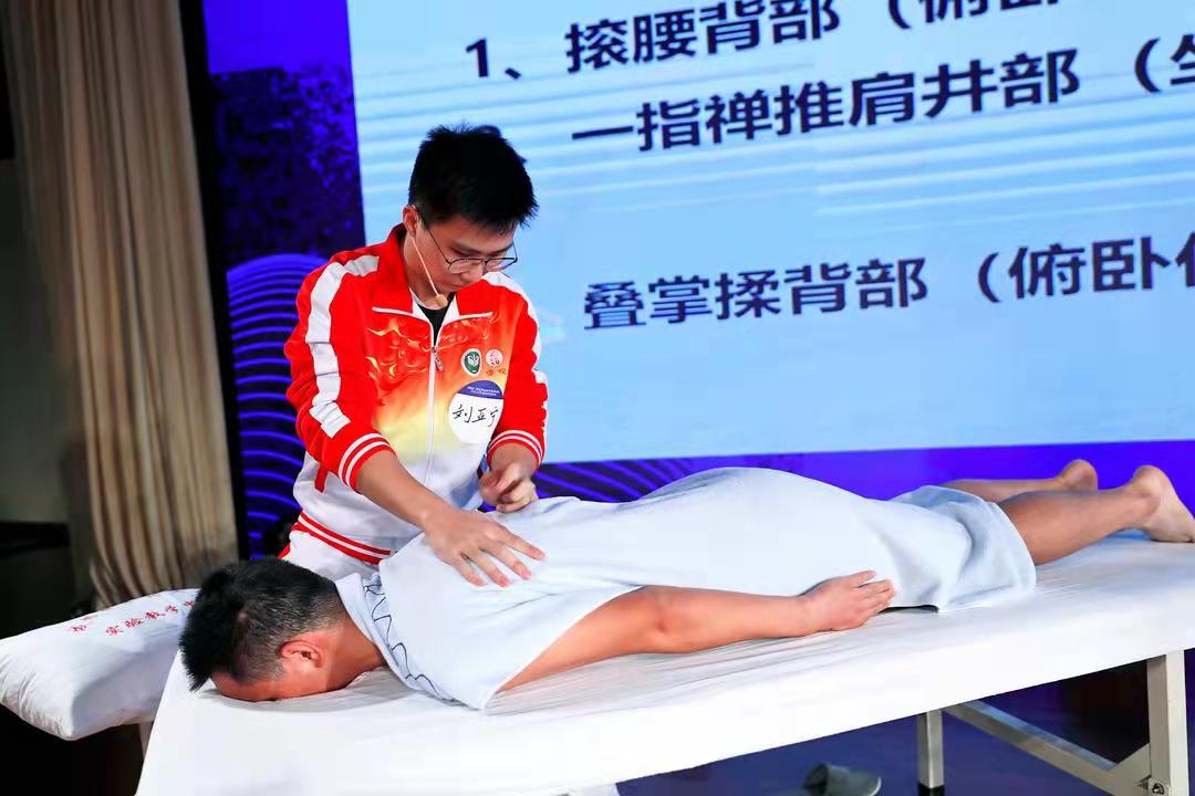 在教师组决赛的推拿环节,9位选手同台操作,限时6分钟。由裁判代表抽签选择出了本轮比赛题目的操作部位——腰椎间盘突出症。选手操作时,裁判上台逐一为选手打分,去除最高分和最低分,取另3位裁判的平均分,乘0.2系数即为该选手的最终得分。相对简短的6分钟操作时间,全方位考验参赛教师的针灸推拿临床技能水平和现场应变能力。
