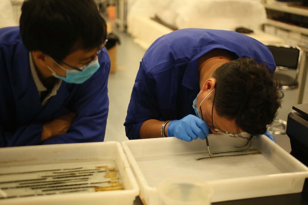 科研人员正在清理揭剥竹简