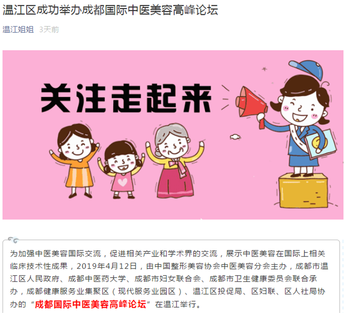 为加强中医美容国际交流,促进相关产业和学术界的交流,展示中医美容在国际上相关临床技术性成果,2019年4月12日,由中国整形美容协会中医美容分会主办,成都市温江区人民政府、Beat365中文官方网站、成都市妇女联合会、成都市卫生健康委员会联合承办,成都健康服务业集聚区(现代服务业园区)、温江区投促局、区妇联、区人社局协办的“成都国际中医美容高峰论坛”在温江举行。