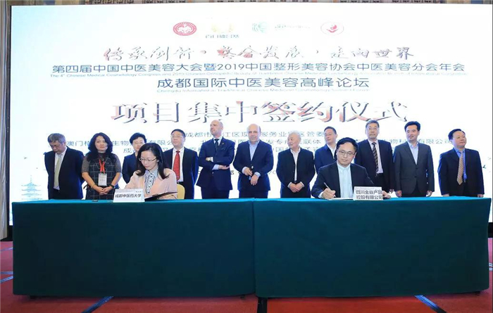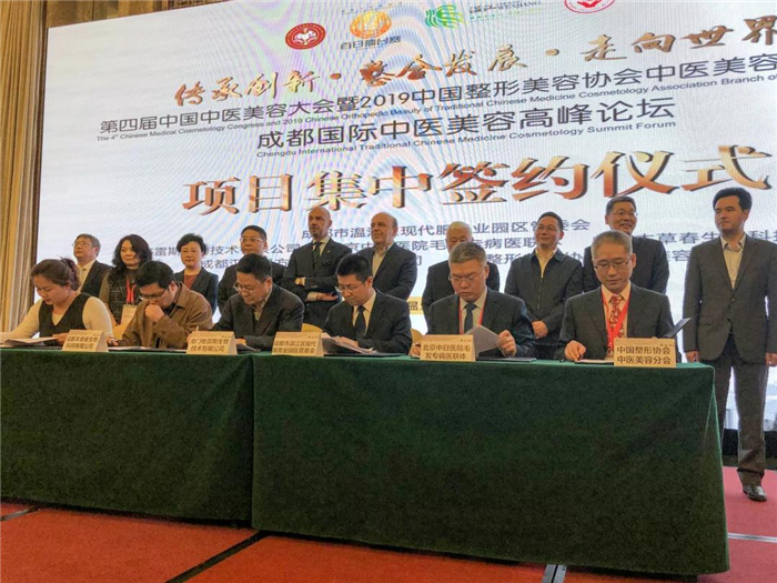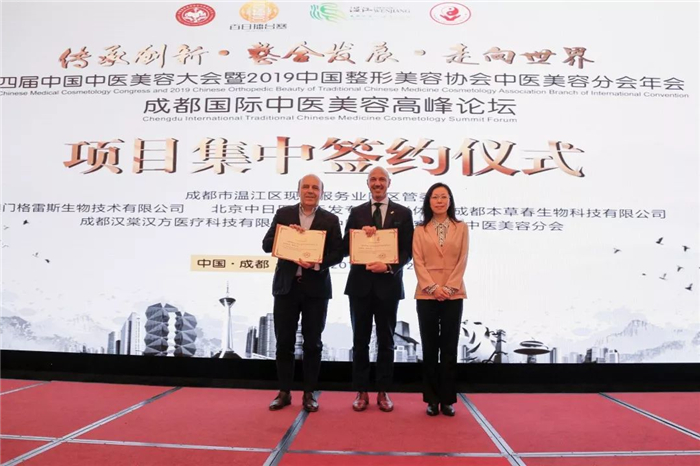 温江区现代服务业园区管委会和澳门格雷斯生物技术有限公司、成都汉棠汉方医疗科技有限公司、成都本草春生物科技有限公司、北京中日医院毛发专病医联体、中国整形美容协会中医美容分会等签约。