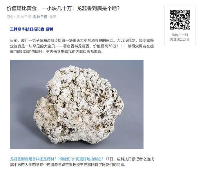 “因极为难得,自古以来它就是名贵中药,也是高级香料。”他说,如《本草纲目》中就有龙涎香可以“活血、益精髓、助阳道、通利血脉”的记载。传统中医认为,龙涎香味甘,酸、涩,性温,归心、肝、肺、肾经。具有行气活血、散结止痛、利水通淋的功效,常用于神昏气闷、心腹诸痛、消癥散结、咳嗽气喘等症的治疗。