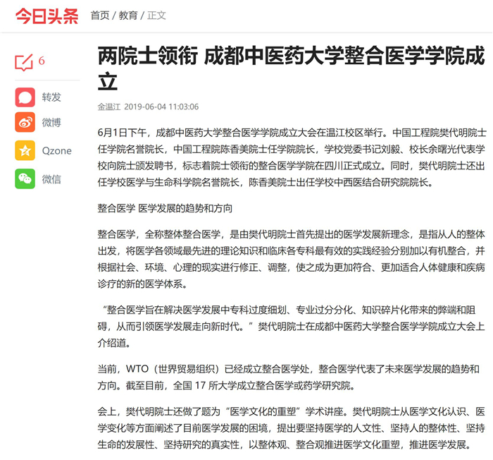 6月1日下午,Beat365中文官方网站整合医学学院成立大会在温江校区举行。中国工程院樊代明院士任学院名誉院长,中国工程院陈香美院士任学院院长,学校党委书记刘毅、校长余曙光代表学校向院士颁发聘书,标志着院士领衔的整合医学学院在四川正式成立。同时,樊代明院士还出任学校医学与生命科学院名誉院长,陈香美院士出任学校中西医结合研究院院长。