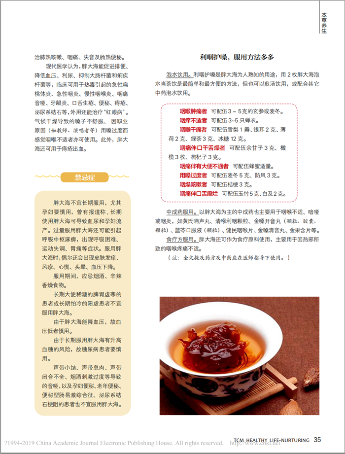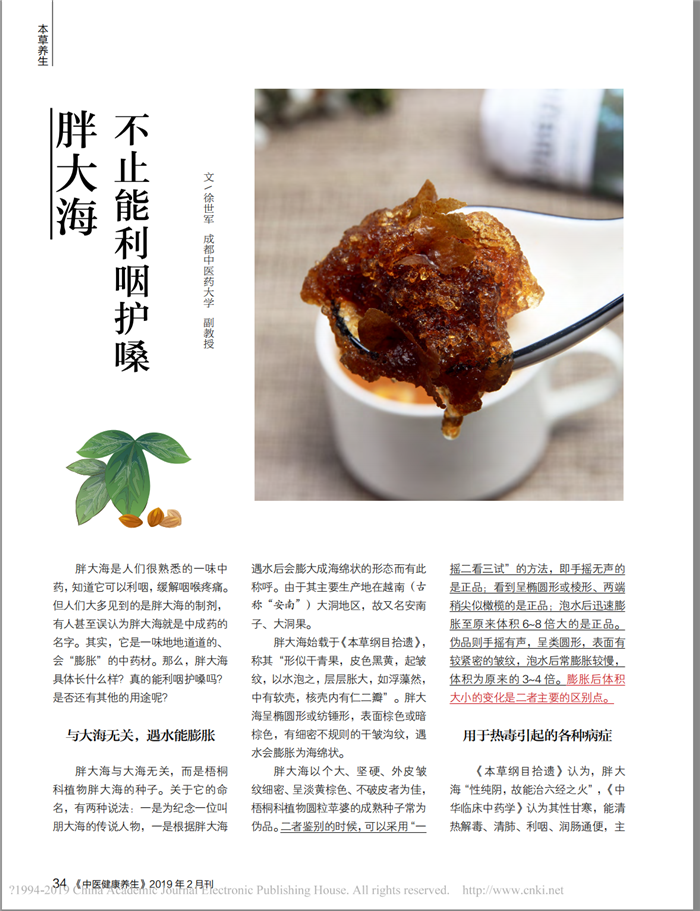 《中医健康养生》:胖大海不止能利咽护嗓(药学院 徐世军) 发布时间:2019-02-27 00:00:00 浏览次数: 次 【字体:小 大】 《中医健康养生》杂志是由国家中医药管理局主管、《中国中医药报》社主办、全国发行的权威中医科普月刊,依托中医药行业权威丰富的信息和国家级专家资源库,向广大读者提供权威、科学、地道的中医养生保健知识和技能,弘扬优秀中医养生文化,正确引导养生保健舆论。2019年第二期特约Beat365药学院徐世军教授撰写科普文章。 【打印正文】 上一条:《中医健康养生》:孩子能吃辣条吗(养生康复学院 夏丽娜) 下一条:天虎科技:中医披上科技的力量 “中医药扶贫”如何借助互联网的力量?