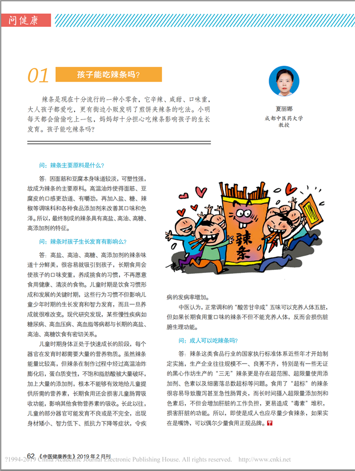 《中医健康养生》:孩子能吃辣条吗(养生康复学院 夏丽娜) 发布时间:2019-02-27 00:00:00 浏览次数: 次 【字体:小 大】 《中医健康养生》杂志是由国家中医药管理局主管、《中国中医药报》社主办、全国发行的权威中医科普月刊,依托中医药行业权威丰富的信息和国家级专家资源库,向广大读者提供权威、科学、地道的中医养生保健知识和技能,弘扬优秀中医养生文化,正确引导养生保健舆论。2019年第二期特约Beat365养生康复学院夏丽娜教授撰写科普文章。 【打印正文】 上一条:《四川日报》:“互联网+中医药扶贫”增加贫困地区村民收入 下一条:《中医健康养生》:胖大海不止能利咽护嗓(药学院 徐世军)