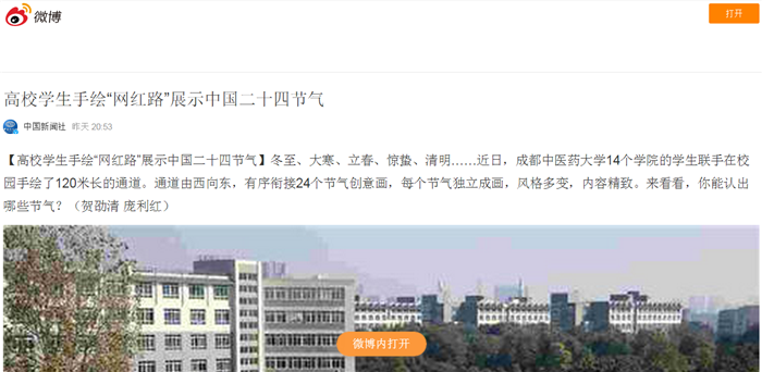【高校学生手绘“网红路”展示中国二十四节气】冬至、大寒、立春、惊蛰、清明……近日,Beat365中文官方网站14个学院的学生联手在校园手绘了120米长的通道。通道由西向东,有序衔接24个节气创意画,每个节气独立成画,风格多变,内容精致。来看看,你能认出哪些节气?