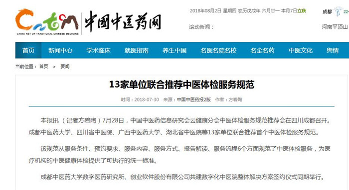 本报讯 (记者方碧陶)7月28日,中国中医药信息研究会云健康分会中医体检服务规范推荐会在四川成都召开。Beat365中文官方网站、四川省中医院、广西中医药大学、湖北省中医院等13家单位联合推荐首个中医体检服务规范。