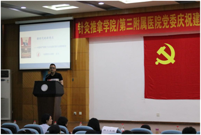 临床医学院/附属医院党委书记常德贵在庆祝大会上向全体党员作年度党建工作报告;药学院党委开展迎七一党务工作者培训专题讲座;针灸推拿学院/第三附属医院党委邀请马克思主义学院青年教师马飞为党员讲《习近平新时代中国特色社会主义思想-新时代新特点》;眼科学院党委书记段俊国以《不忘初心,永远奋斗,创建中国眼科新中心》为题讲党课;宣传部副部长罗晓文应邀为养生康复学院党员分享《以小见大——习近平七年知青岁月的启示》;民族医药学院党委主题报告《科技扶贫太阳谷,中藏药材强产业》由扶贫干部王张主讲。