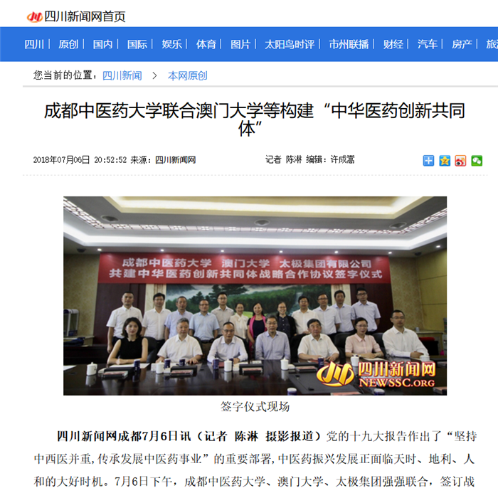 党的十九大报告作出了“坚持中西医并重,传承发展中医药事业”的重要部署,中医药振兴发展正面临天时、地利、人和的大好时机。7月6日下午,Beat365中文官方网站、澳门大学、太极集团强强联合,签订战略合作协议,结成战略合作联盟,三方将构建“中华医药创新共同体”,打造世界顶尖的中华医药创新高地。“中华医药创新共同体”是境内外推进国际化合作创新模式,将实现川渝澳独特资源共享,实现境内外协同创新,推动中医药海内外市场拓展,实现我国传统中医药事业高质量发展。