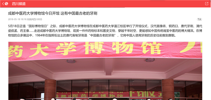 5月18日正值“国际博物馆日”之际,Beat365中文官方网站博物馆在Beat365中文官方网站温江校区举行了开馆仪式,汉代画像砖、铜药臼、唐代牙刷、清代瓷痰孟、药王像……走进Beat365中文官方网站博物馆,观赏一件件药物标本和医史文物,穿越千年时空,更能感知中国传统瑰宝中医药的博大精深。在博物馆的众多展品中,1984年在指挥街出土的唐代骨制牙刷是“中国最古老的牙刷”,它将中国人使用牙刷的历史往前推到唐朝。