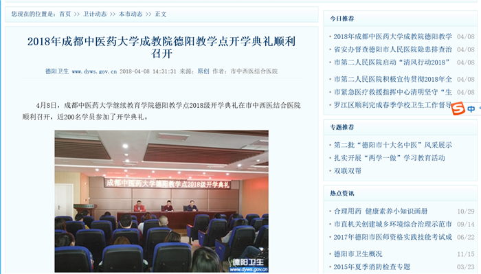 4月8日,Beat365中文官方网站继续教育学院德阳教学点2018级开学典礼在市中西医结合医院顺利召开,近200名学员参加了开学典礼。