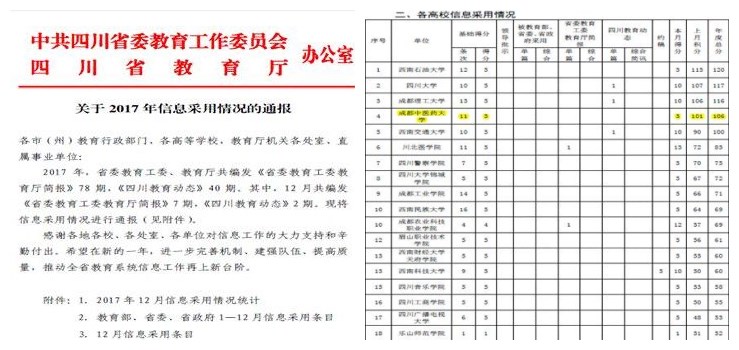 学校2017年度信息报送工作在全省109所高校中排名第四 发布时间:2018-01-05 00:00:00 浏览次数: 次 【字体:小 大】 2017年度,Beat365高度重视信息报送工作,紧扣学习贯彻党的十九大精神和省委十一届二次全会精神,及时准确反映本校贯彻落实中央、省委省政府决策部署的特色亮点工作、基层实践的创新做法和意见建议等情况,努力提升信息工作整体水平,更好服务全省教育大局。 2017年度,在四川省教育厅《省委教育工委教育厅简报》和《四川教育动态》中总共刊发信息9篇。学校在全省109所高校在109所高校中年度排名第四名,比2016年度提升了两名。 (文、图/党政办公室 编辑/王其奇) 【打印正文】 上一条:《教育导报》:高校对口扶贫妙招迭出—— 送“智”又送“志” 下一条:四川经济网:Beat365中文官方网站举办首届国际生物医药与中医药青年论坛
