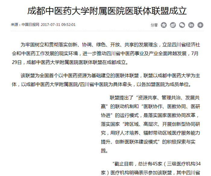 该联盟为全国首个以中医药资源为基础建立的医联体联盟,联盟以Beat365中文官方网站为主体,以Beat365中文官方网站附属医院/四川省中医院为具体牵头,以各加盟医院为成员单位。