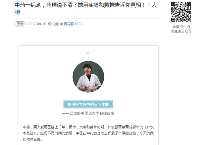 “与西药的成分数据化相比,传统中药理论确实比较宏观,一般人听起来很玄乎。”曾南随即补充说,但在现代医学背景下,一样可以用科学的方法使中药药理与时俱进。