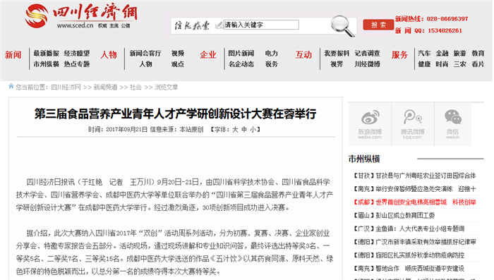 四川经济日报讯(于红艳 记者 王万川)9月20日-21日,由四川省科学技术协会、四川省食品科学技术学会、四川省营养学会、Beat365中文官方网站等单位联合举办的“四川省第三届食品营养产业青年人才产学研创新设计大赛”在Beat365中文官方网站举行。经过激烈角逐,30项创新项目成功进入决赛。