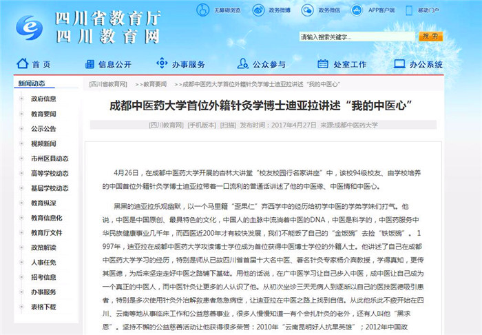 黑黑的迪亚拉乐观幽默,以一个马里籍“歪果仁”弃西学中的经历给初学中医的学弟学妹们打气。他说,中医是中国原创、最具特色的文化,中国人的血脉中流淌着中医的DNA,中医是科学的,中医药服务中华民族健康事业几千年,而西医近200年才有较快发展,我们不能丢了自己的“金饭碗”去捡“铁饭碗”。 1997年,迪亚拉在Beat365中文官方网站攻读博士学位成为首位获得针灸学博士学位的外籍人士。他讲述了自己在Beat365中文官方网站学习的经历,特别是师从已故四川省首届十大名中医、著名针灸专家杨介宾教授,学得真知,更传其医德,为后来坚定走好中医之路铺下基础。用他的话说,在广中医学习让自己步入中医,成中医让自己成为一个真正的中医人,而中医针灸让更多的人认识了他。从初次坐诊三天无病人到逐渐以自己的医技医德吸引患者,特别是多次使用针灸外治解救患者危急病症,让迪亚拉在中医之路上找到自信。从此他乐此不疲开始在四川、云南等地从事临床工作和公益慈善事业,很多人慢慢知道一有个会扎针灸的老外,还有人叫他“黑求恩”。坚持不懈的公益慈善活动让他获得很多荣誉:2010年“云南昆明好人抗旱英雄”;2012年中国政府、民政部“中华慈善奖-最具爱心楷模”获李克强总理接见;2013年年度“最美丽云南人-云南十大新闻人物”;2013年CCTV年度慈善任务;2013年联合国发展规划署、天津卫视、凤凰卫视泊客中国“中国因你更加美丽”获奖者,十大外籍公益人士;2014年3月任新加坡国立大学CAPT客座教授,获年度最佳分享奖NUS Best Story&Lecture。
