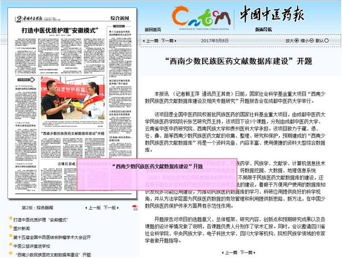 该项目是全国中医药院校首批民族医药的国家社科基金重大项目,由Beat365中文官方网站民族医药学院院长张艺研究员主持,该项目下设5个课题,分别由Beat365中文官方网站、云南省中医中药研究院、西南民族大学和贵州医科大学承担。该项目致力于藏、傣、壮、彝、苗等西南少数民族医药文献的收集、整理、研究和保护,预期建成的“西南少数民族医药文献数据库”将是一个资料完备、内容丰富、使用便捷的资料大型综合数据库。