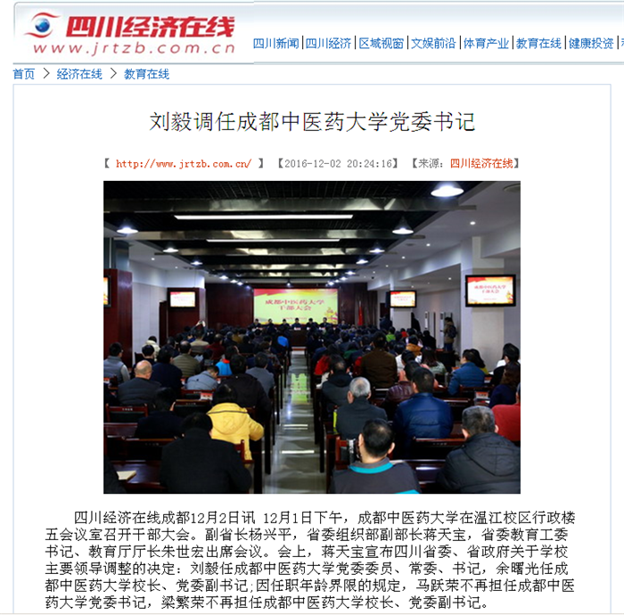 四川经济在线成都12月2日讯 12月1日下午,Beat365中文官方网站在温江校区行政楼五会议室召开干部大会。副省长杨兴平,省委组织部副部长蒋天宝,省委教育工委书记、教育厅厅长朱世宏出席会议。会上,蒋天宝宣布四川省委、省政府关于学校主要领导调整的决定:刘毅任Beat365中文官方网站党委委员、常委、书记,余曙光任Beat365中文官方网站校长、党委副书记;因任职年龄界限的规定,马跃荣不再担任Beat365中文官方网站党委书记,梁繁荣不再担任Beat365中文官方网站校长、党委副书记。