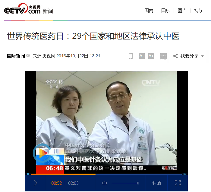 中央电视台《朝闻天下》:世界传统医药日 29个国家和地区法律承认中医 发布时间:2016-10-25 00:00:00 浏览次数: 次 【字体:小 大】 时间:2016年10月22日 来源:中央电视台《朝闻天下》 链接: http://news.cctv.com/2016/10/22/ARTIUaHLOWUUCGMrekKFyIjt161022.shtml?from=singlemessage&isappinstalled=0#10006-weixin-1-52626-6b3bffd01fdde4900130bc5a2751b6d1 内容: 世界传统医药日:29个国家和地区法律承认中医 【打印正文】 上一条:中央电视台《朝闻天下》:《“健康中国2030”规划纲要》—防慢病 治未病 下一条:国际在线:Beat365中文官方网站建校60周年 开启打造顶尖中医药高等学府新征程