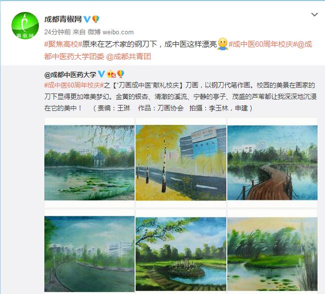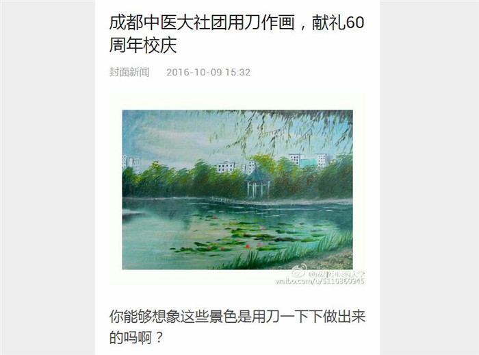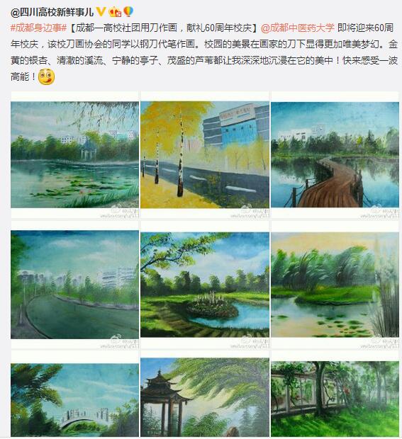 刀画集国画、油画之长刀,作画时,以刮、拉、挫等刀法为主,校园美景在这一刮一拉中,竟然有一丝柔美梦幻的意境,金黄的银杏、清澈的溪流、宁静的亭子、茂盛的芦苇在画面中充分展现了刀法的精湛,真是刀刀有章法呀!厉害了我的同学!快来感受一波高能!(封面新闻:樱桃大丸子)