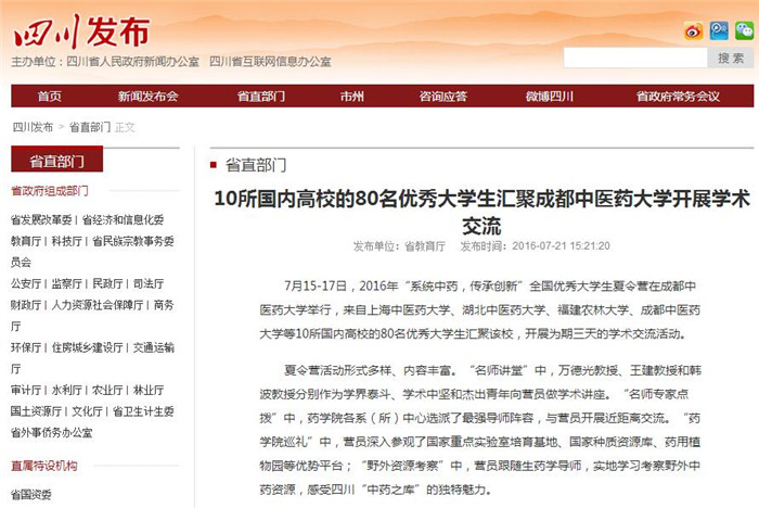 7月15-17日,2016年“系统中药,传承创新”全国优秀大学生夏令营在Beat365中文官方网站举行,来自上海中医药大学、湖北中医药大学、福建农林大学、Beat365中文官方网站等10所国内高校的80名优秀大学生汇聚该校,开展为期三天的学术交流活动。