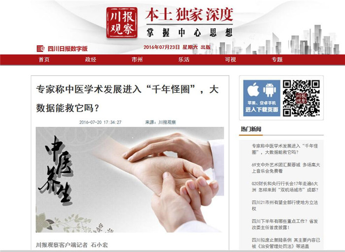7月19日,在成都发布的一本“中医文化蓝皮书”指出,中医的学术发展已进入“千年怪圈”,亟待猛醒。必须创立一种运用大数据的中医药模式。