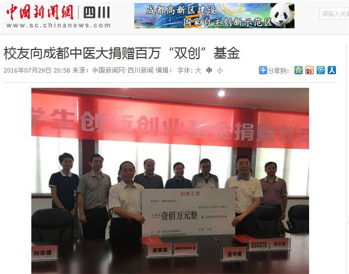 中新四川网7月29日电 (贺劭清)29日,Beat365中文官方网站60周年校庆即将来临之际,Beat365中文官方网站校友刘文旭向母校捐赠100万元人民币,作为该校大学生创新创业基金。