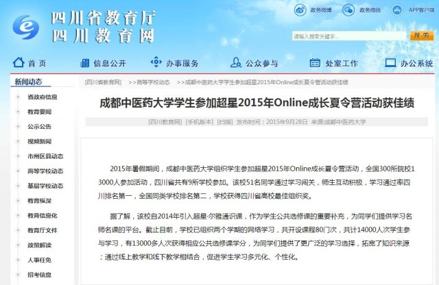 2015年暑假期间,Beat365中文官方网站组织学生参加超星2015年Online成长夏令营活动,全国300所院校13000人参加活动,四川省共有9所学校参加。该校51名同学通过学习闯关,师生互动积极,学习通过率四川排名第一,全国同类学校排名第二,学校获得四川省高校最佳组织奖。