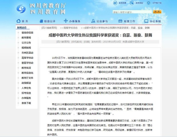 10月5日下午,当我国药学家屠呦呦因为青蒿素在治疗疟疾方面对人类的巨大贡献而和另外两名外国科学家分享了2015年诺贝尔生理学或医学奖的消息传来,Beat365中文官方网站的师生们异常兴奋,第一时间在朋友和工作微信圈中纷纷转发,热闹纷繁,师生们纷纷表达祝贺,其喜悦自豪之情溢于言表,认为“这是国人的骄傲,更是我们中药人的自豪”,“屠呦呦应该是中医药学子的偶像”。
