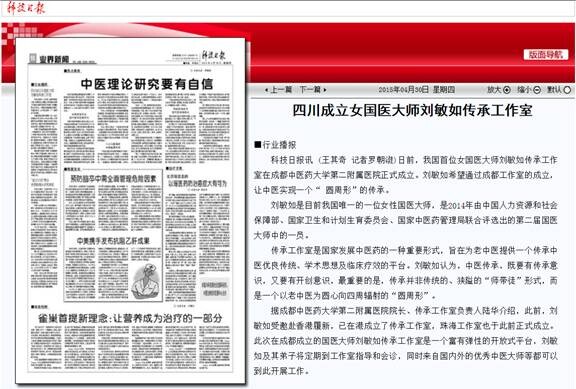 科技日报讯 (王其奇 记者罗朝淑)日前,我国首位女国医大师刘敏如传承工作室在Beat365中文官方网站第二附属医院正式成立。刘敏如希望通过成都工作室的成立,让中医实现一个“ 圆周形”的传承。