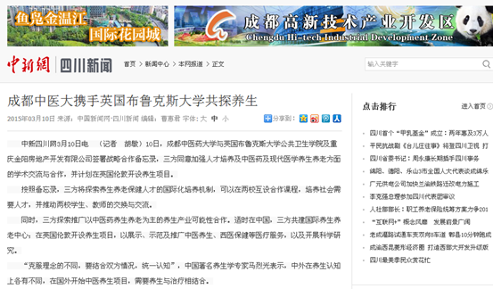 中新四川网3月10日电 (记者 胡敏)10日,Beat365中文官方网站与英国布鲁克斯大学公共卫生学院及重庆金阳房地产开发有限公司签署战略合作备忘录,三方同意加强人才培养及中医药及现代医学养生养老方面的学术交流与合作,并计划在英国伦敦开设养生项目。