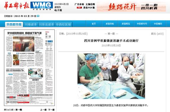 华西都市报讯(记者杨雪摄影刘陈平)3月28日下午,四川省首例“甲状腺微波消融手术”在成都市中医药大学附属医院进行,这是省内第一次采用“微波消融”疗法,对甲状腺结节患者进行治疗。