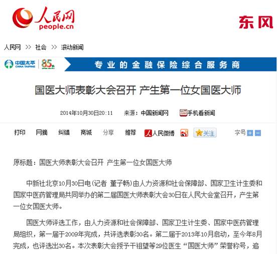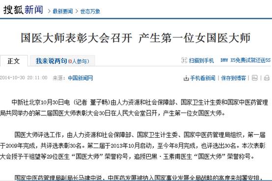 中新社北京10月30日电(记者 董子畅)由人力资源和社会保障部、国家卫生计生委和国家中医药管理局共同举办的第二届国医大师表彰大会30日在人民大会堂召开,产生第一位女国医大师。