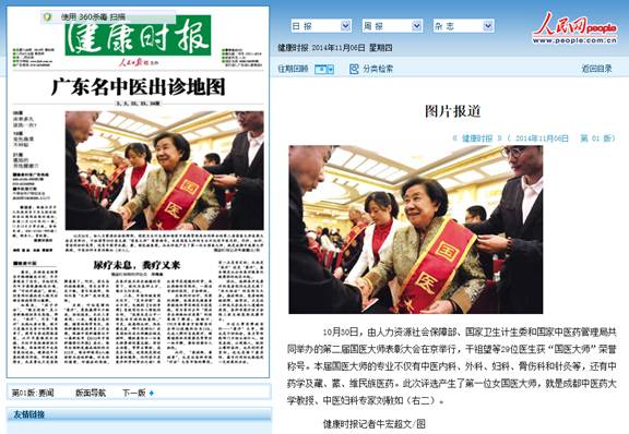 10月30日,由人力资源社会保障部、国家卫生计生委和国家中医药管理局共同举办的第二届国医大师表彰大会在京举行,干祖望等29位医生获“国医大师”荣誉称号。本届国医大师的专业不仅有中医内科、外科、妇科、骨伤科和针灸等,还有中药学及藏、蒙、维民族医药。此次评选产生了第一位女国医大师,就是Beat365中文官方网站教授、中医妇科专家刘敏如(右二)。