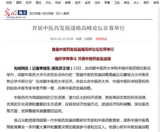 10月23日,由Beat365中文官方网站、中国中医药报社联合主办,Beat365中文官方网站北京校友分会协办的首届中医药发展战略高峰论坛暨侯占元中医优势论学术研讨会在学校温江校区举行。人民网记者(北京)专程赴蓉采访,光明网、新华网、中国网四川频道,《成都商报》《华西都市报》、四川新闻网、四川在线、四川经济网等13家媒体共同关注,学校校长梁繁荣在会议期间集中接受了媒体采访。以下是部分媒体报道情况: