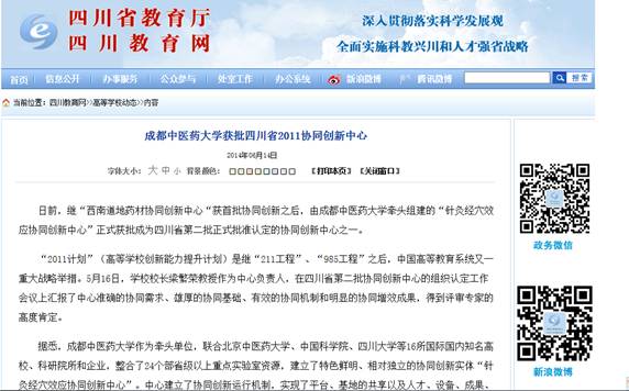 日前,继“西南道地药材协同创新中心“获首批协同创新之后,由Beat365中文官方网站牵头组建的“针灸经穴效应协同创新中心”正式获批成为四川省第二批正式批准认定的协同创新中心之一。