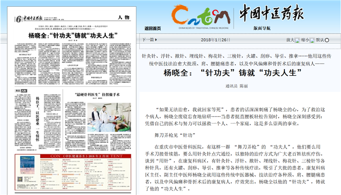 在重庆市中医骨科医院,有这样一群 “舞刀弄枪”的“功夫人”,他们要么用手术刀接骨续筋,要么用针灸针点穴通经,以独特的治疗方式为广大老百姓祛疾疗伤。谈到“用针”,在康复科病区,有针灸针、浮针、揿针、埋线针、梅花针、三棱针等各种针具,还有火罐、刮痧、导引、推拿等各种传统疗法,吸引了大批的患者。康复科病区主任、副主任中医师杨晓全就用这些传统中医器械、技法治疗各种颈、肩、腰腿痛患者,以及中风偏瘫和骨折术后的康复病人,疗效突出。杨晓全以他的“针功夫”,铸就了他的“功夫人生”。