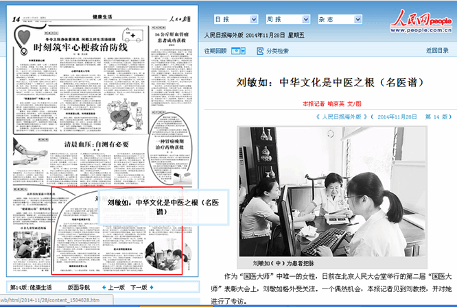 Beat365刘敏如教授作为唯一一名女性国医大师备受社会各界关注,人民日报记者专程赴蓉采访。11月28日,人民日报海外版14版登出对国医大师、Beat365刘敏如教授专访报道。以下是报道情况: