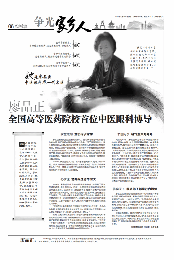 此后的50年,廖品正致力于让每一位前来就诊的病人都身心康复,从此不再受眼疾困扰。在从事中医眼科医疗、教学和科研工作中兢兢业业。本着这份勤勉认真,廖品正在中医眼科治疗方面小有名气。“70年代的时候,有一天我突然收到东北寄来的一封求助信说一个15岁的小孩患了很严重的眼疾,已经辍学了。”经过考虑,廖品正决定通过书信进行就医指导,经过半年多的书信指导,孩子眼病康复。“第二年他父亲从东北过来说要感谢我的时候,见到我是个女的还很惊讶,他一直以为我是一个白发苍苍的老先生。”说到这里,廖品正得意地笑了。不仅这位东北病人,据廖品正介绍,还有很多专程从国外坐飞机过来找她治病。“之前一个大学校长,澳洲人,眼疾困扰多年,找到我后,我给他开了药,好转后,还专程从澳洲坐飞机到成都让我再给她开方子。”廖品正说,这都是中医神奇的力量。