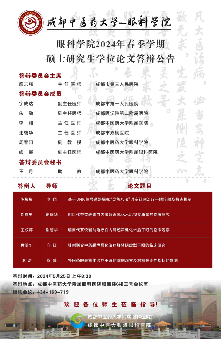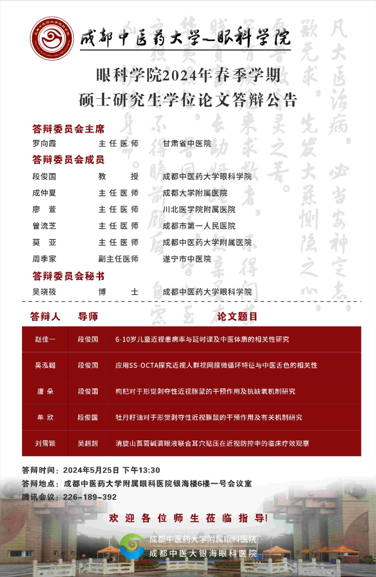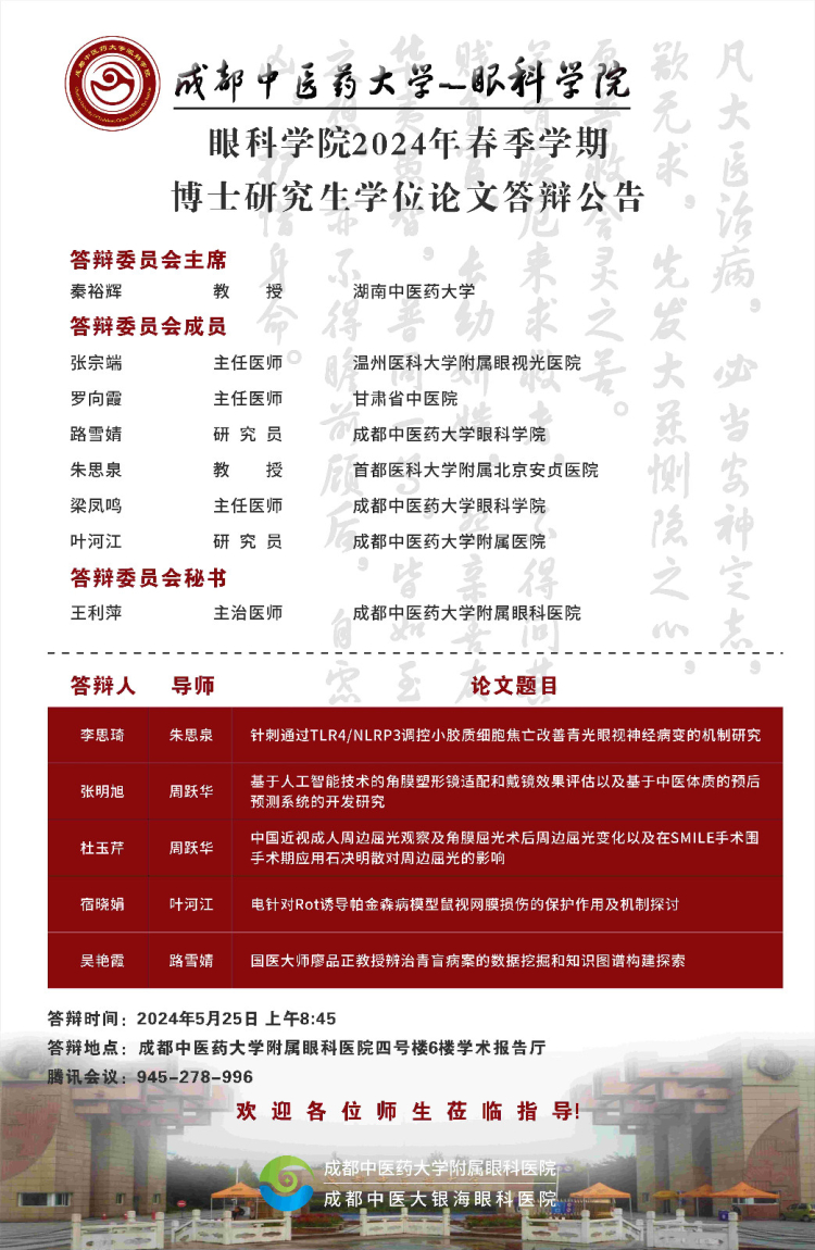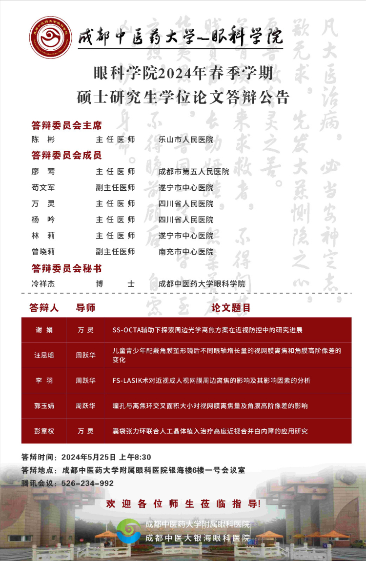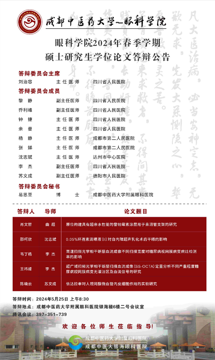Beat365中文官方网站眼科学院2024届硕博士研究生学位论文答辩会将于2024年5月25日举行,具体答辩信息如下图所示: