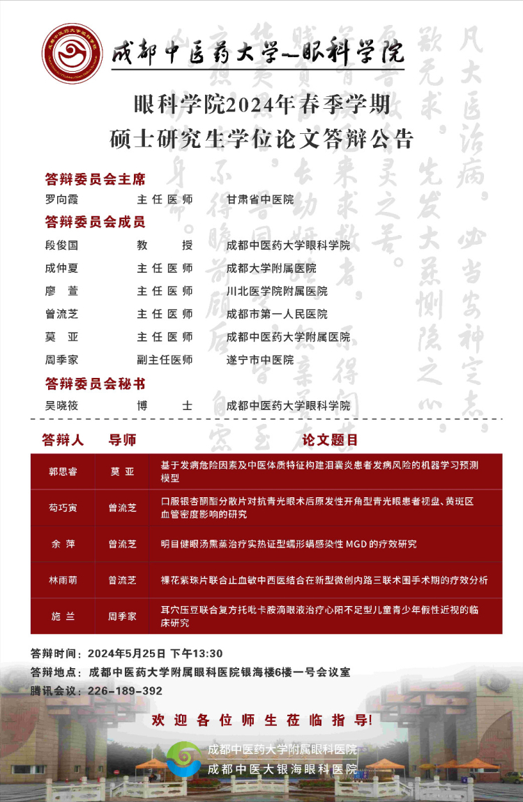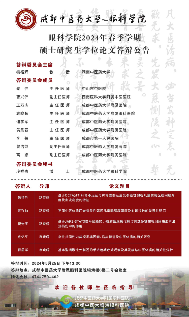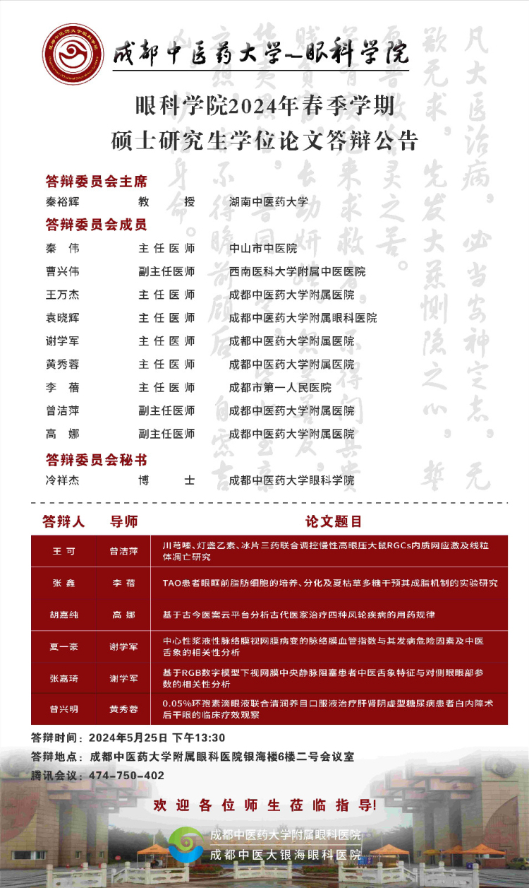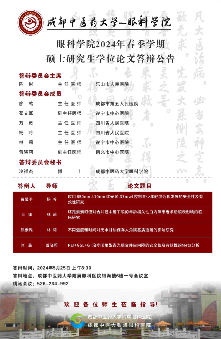 Beat365中文官方网站眼科学院2024届硕博士研究生学位论文答辩会将于2024年5月25日举行,具体答辩信息如下图所示: