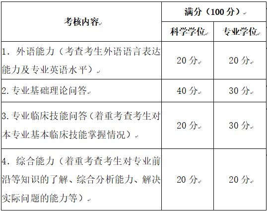 面试内容分为专业综合面试(专业基础理论、临床技能及综合能力)、外语能力测试。考生随机抽取复试考题库中的试题作答,每名考生面试时间不得少于20分钟,各项分值见下表所示。