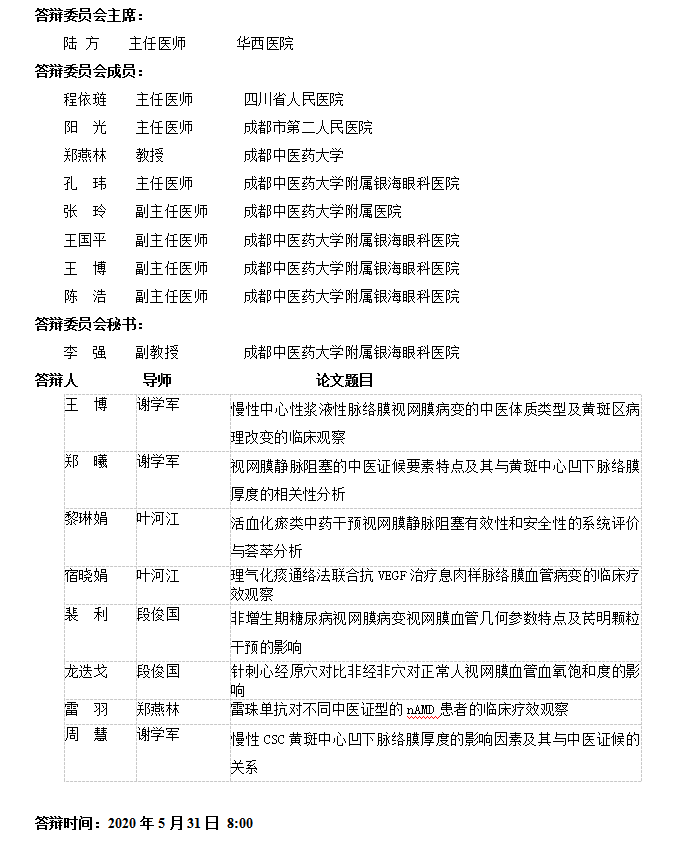 眼科学院2020年硕士研究生学位论文答辩公告(二)