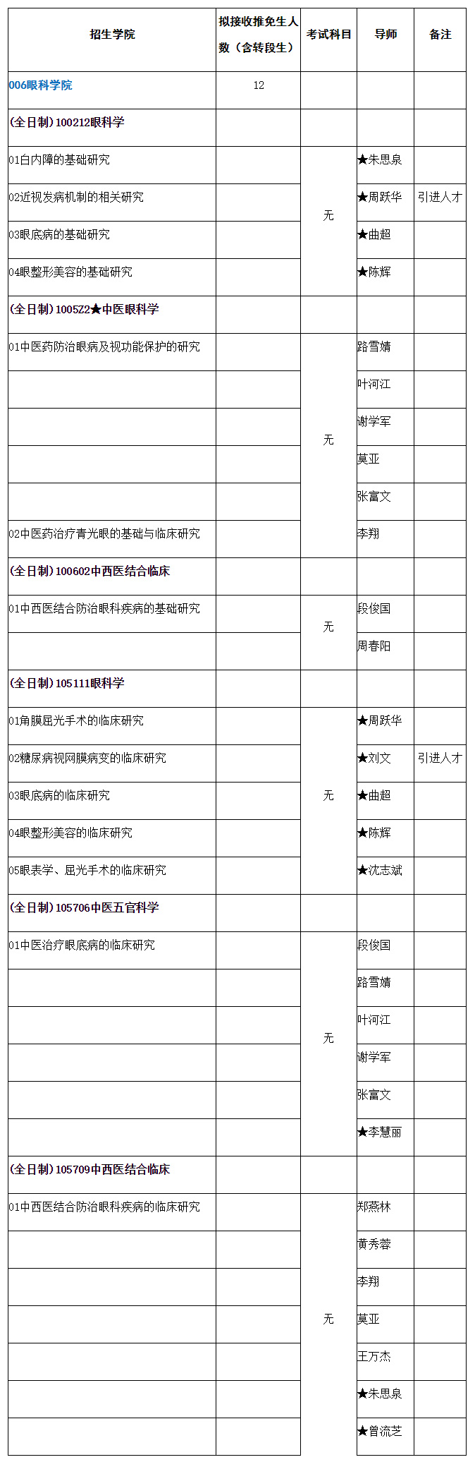 2、眼科学院科学学位(专业代码:1005Z2、100602及100212)限招医学全日制普通本科毕业生、医学技术(眼视光学)全日制普通本科毕业生,且本科毕业授予医学学位或理学学位(眼视光学)。