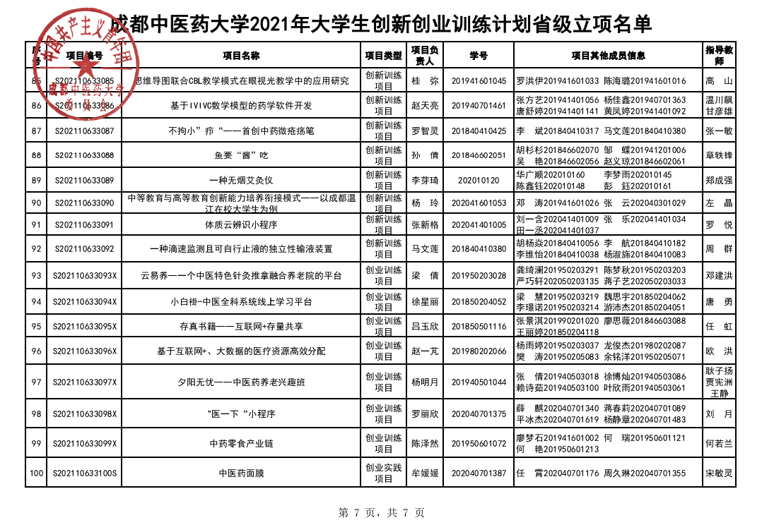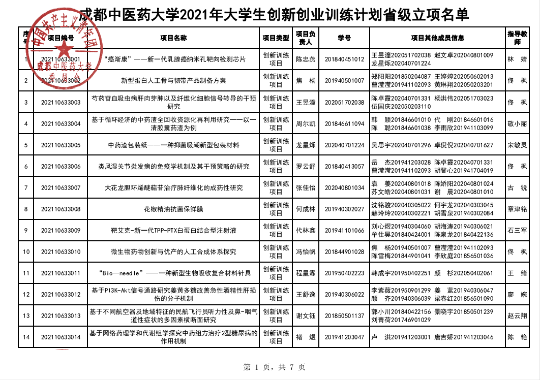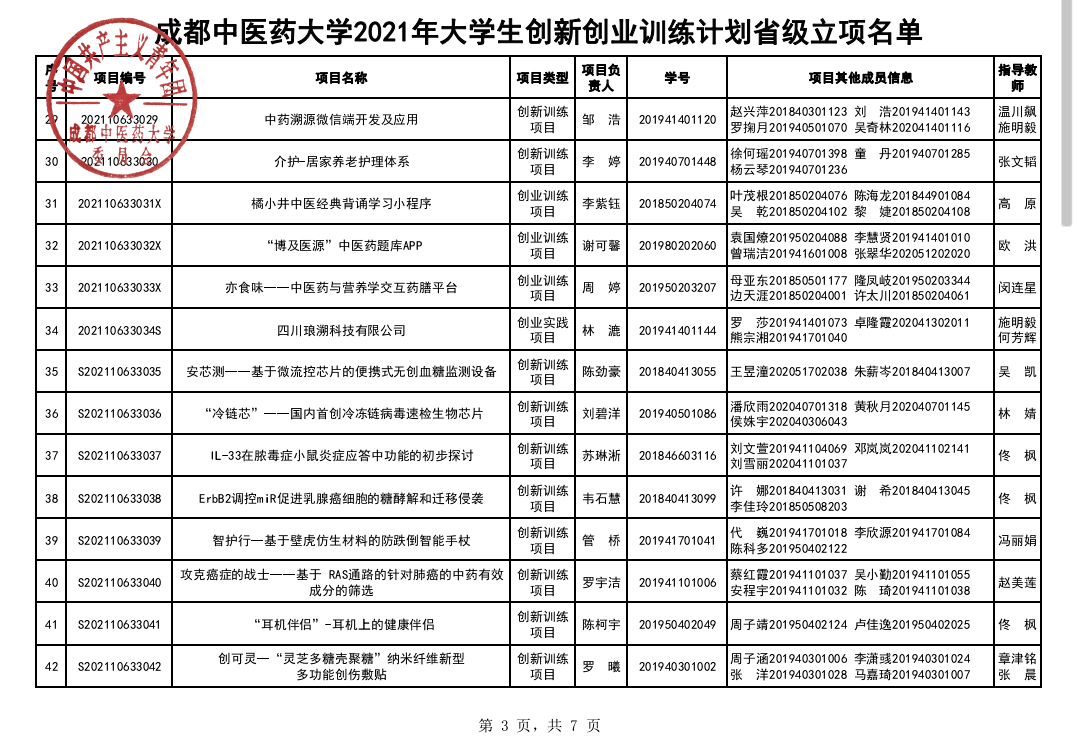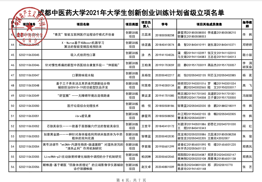 根据成中医团〔2021〕9号文件关于《开展Beat365中文官方网站 2021 年大学生创新创业训练计划立项工作的通知》的要求,校团委积极开展了2021年大学生创新创业训练计划立项工作,现已完成立项名单公示,我院共有4个项目入选。