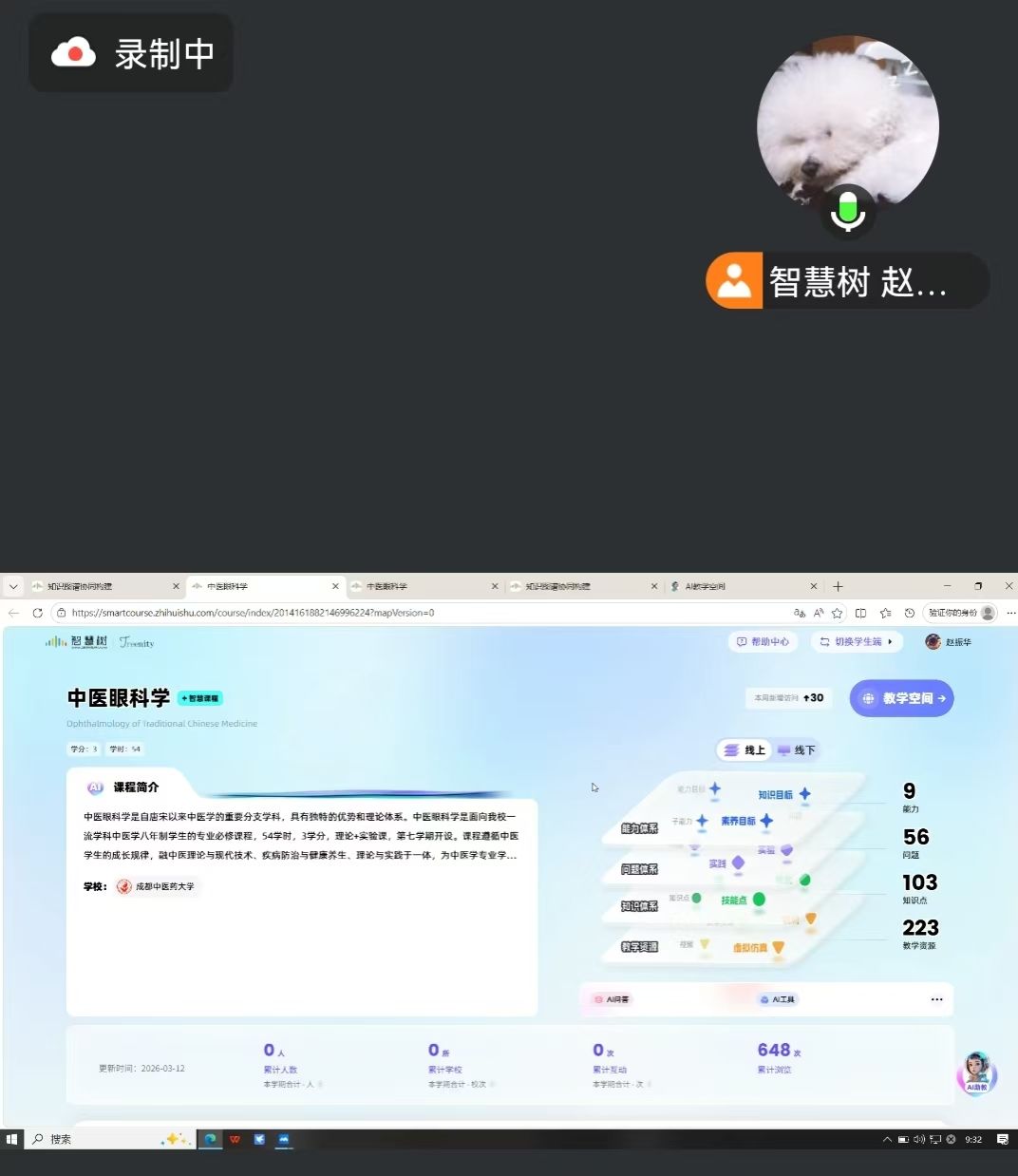 会上,智慧树平台课程顾问就双方合作建设的《中医眼科》课程,进行了阶段性汇报。经双方的紧密合作,目前已完成该课程框架设计、知识点拆解及初步视频素材采集。平台方重点展示了四维课程体系、知识图谱、问题图谱、能力图谱、思政图谱搭建情况,已上传教学资源223个,知识模块103个,将抽象的中医眼科理论转化为可视化、可操作的沉浸式学习场景。
